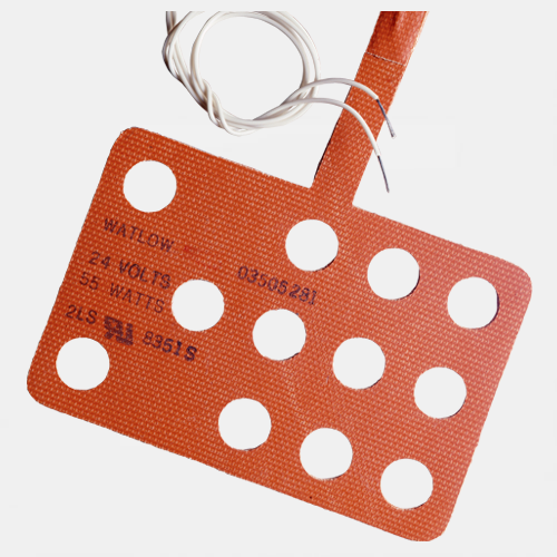 Watlow silicone rubber heaters are rugged, yet thin, lightweight and flexible. Use of these heaters is limited only by the imagination. Heat can be put where it is needed. These silicone heaters improve heat transfer, speed warm ups, and decrease wattage requirements. Fiberglass-reinforced silicone rubber gives the heater dimensional stability without sacrificing flexibility. Because very little material separates the element from the part, heat transfer is rapid and efficient. The silicone rubber heaters are constructed with a wire-wound element or an etched foil element. The heater construction creates a very thin heater allowing it to fit applications where space is limited.
